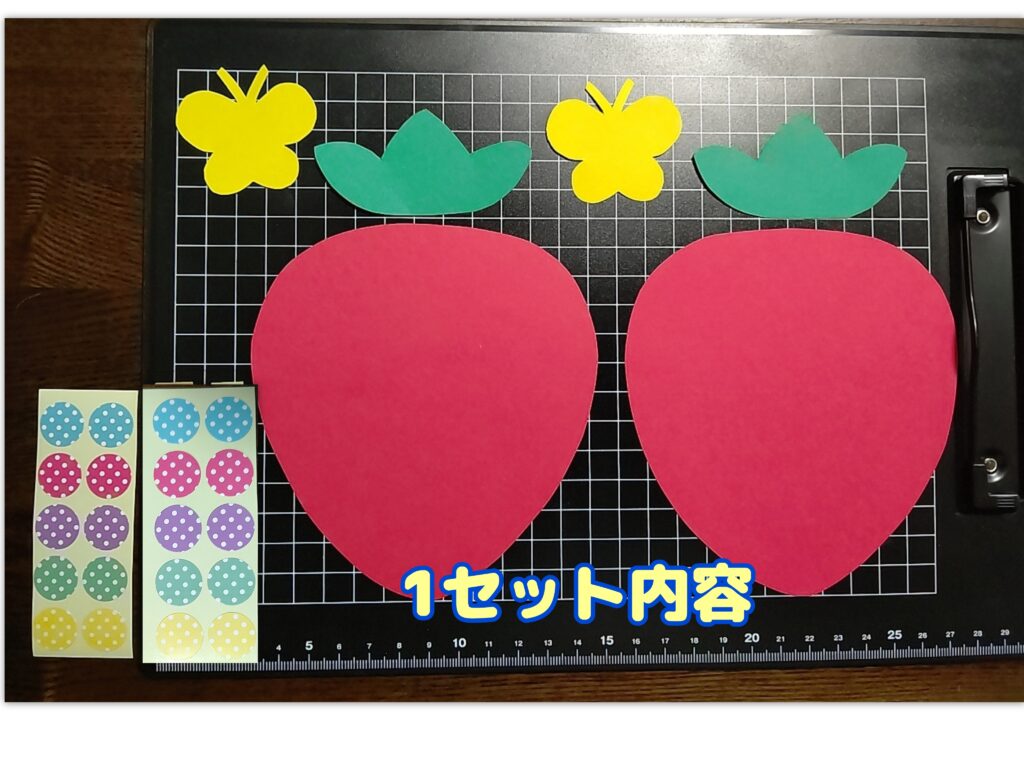 台紙用の画用紙を準備していただき、苺や蝶々を貼って壁面製作に!イチゴ用のたっっぷり丸シールが付属で入っていますので、微細運動になるシール貼りを楽しむことができます♪